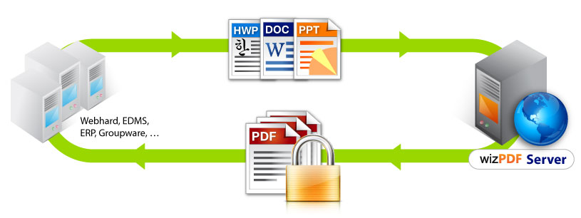 wizPDF Server는 EDMS, 그룹웨어, 웹하드 등의 기존 시스템에 등록되는 다양한 문서를 서버 상에서 자동으로 PDF로 변환해주며 문서 병합, 워터마크,
