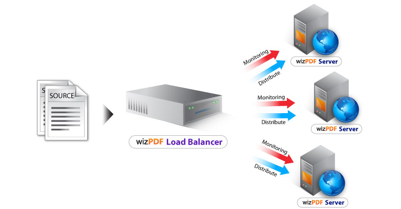 ● 여러 대의 wizPDF Server를 병렬로 연결하여 변환 속도와 안정성 모두를 향상시킬 수 있습니다.